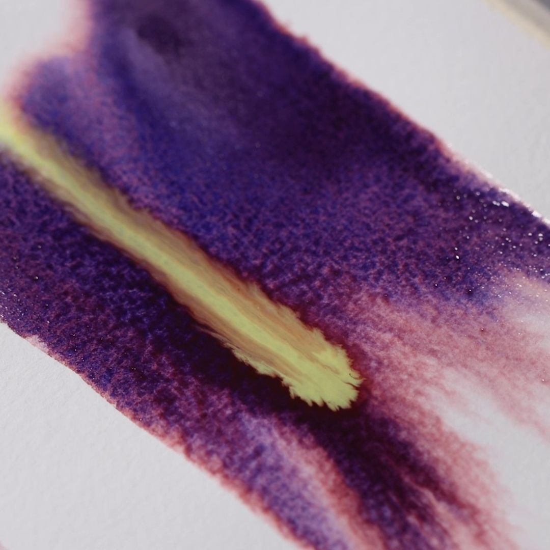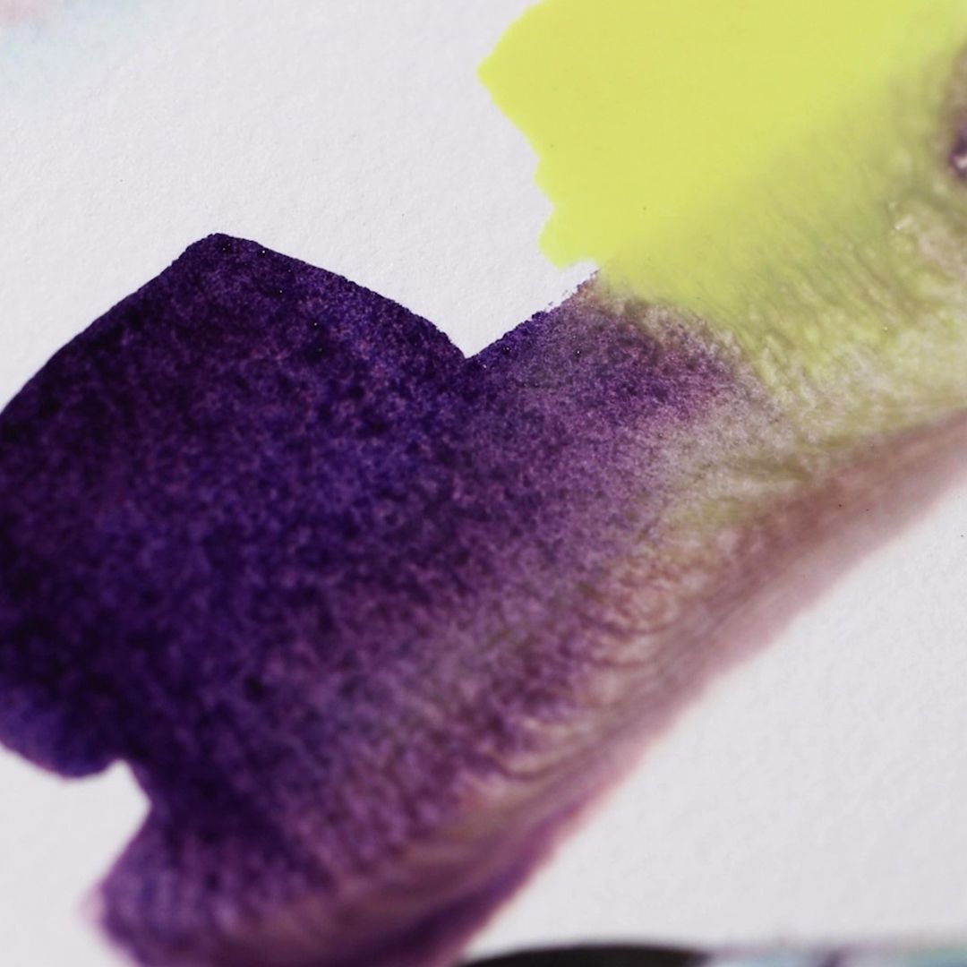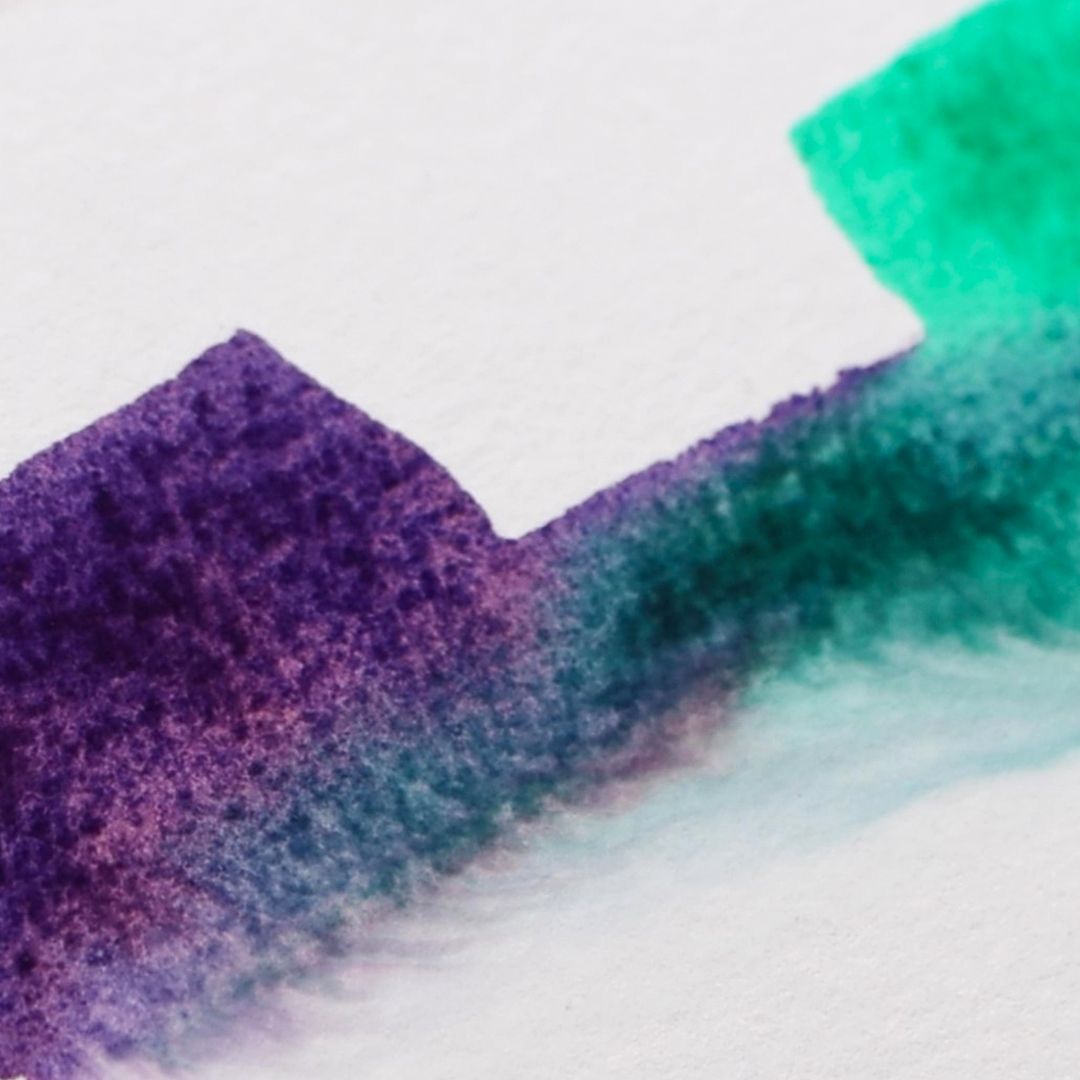 The colour has a complex, beautiful muted purple hue with a clearly visible orange-pink undertone, and has a pronounced granulation effect due to Ultramarine Blue pigment particles. When stretched wet, Sunset Mist produces painterly transitions from muted purple to deep blue surrounded by a light orange-pink halo, creating the illusion of detail in large washes, disintegrating into a cascade of pigments, creating additional texture with granulating pigment particles. This paint is wonderful in landscape painting, especially sunset scenes or city sketches. You can also use it to solve pictorial problems of backgrounds, abstract fills, and sketches of flower bouquets.