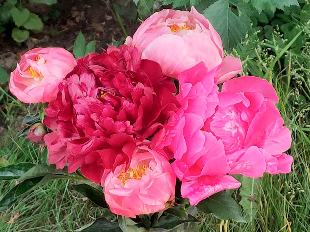 Today we will paint a sketch with peonies. I made a small bouquet with large pink and rich red flowers. One large central flower has a dark deep burgundy-purple colour. The second flower is red-pink, bright and saturated, and 3 half-opened pale pink buds. Green leaves will become a harmonious background, and the yellow center of the bud will become a colour accent.