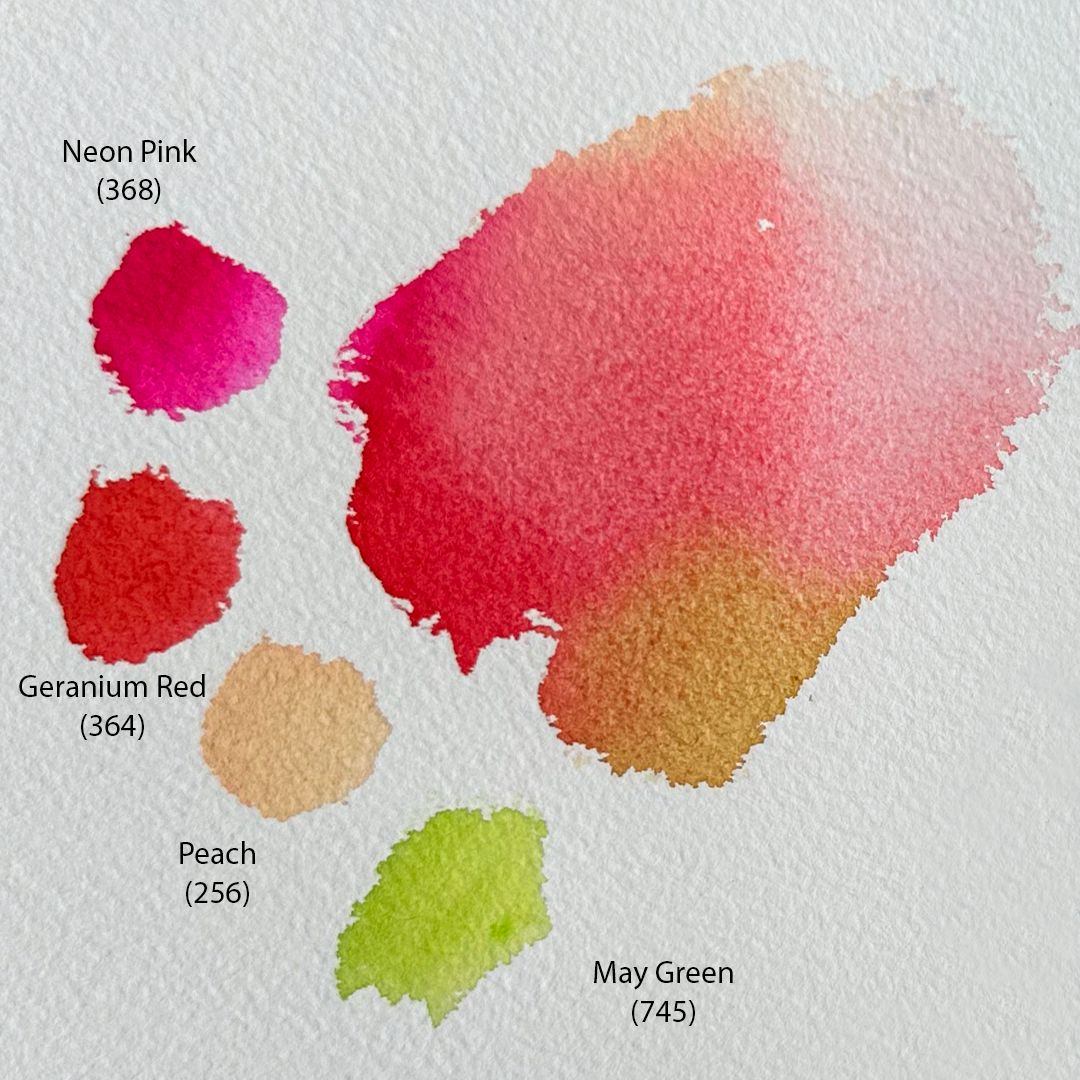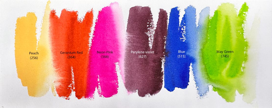 I chose a palette of 6 colours: 1.256. Peach (P.Y.3 P.O.64 P.W.6 *** ■◮), 2.368. Neon Pink (P.R.122, fluor. * ■◮), 3.364. Geranium Red (P.R.242 *** ◨▲ ), 4.627. Perylene violet (P.V. 29 *** □◮), 5.515. Blue (P.B.15:6 *** □▲), 6.745. May Green (P.Y.3, P.G.36 *** □◮).