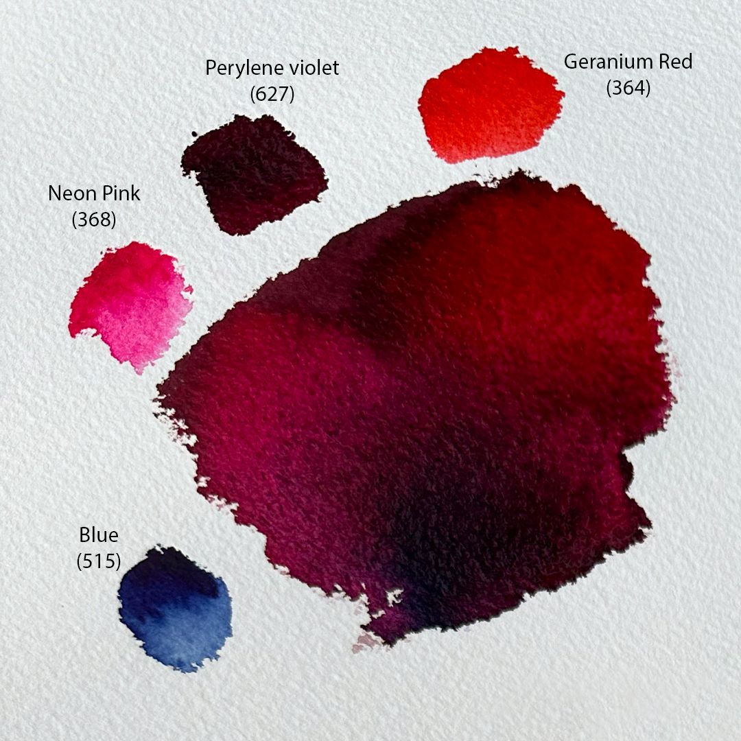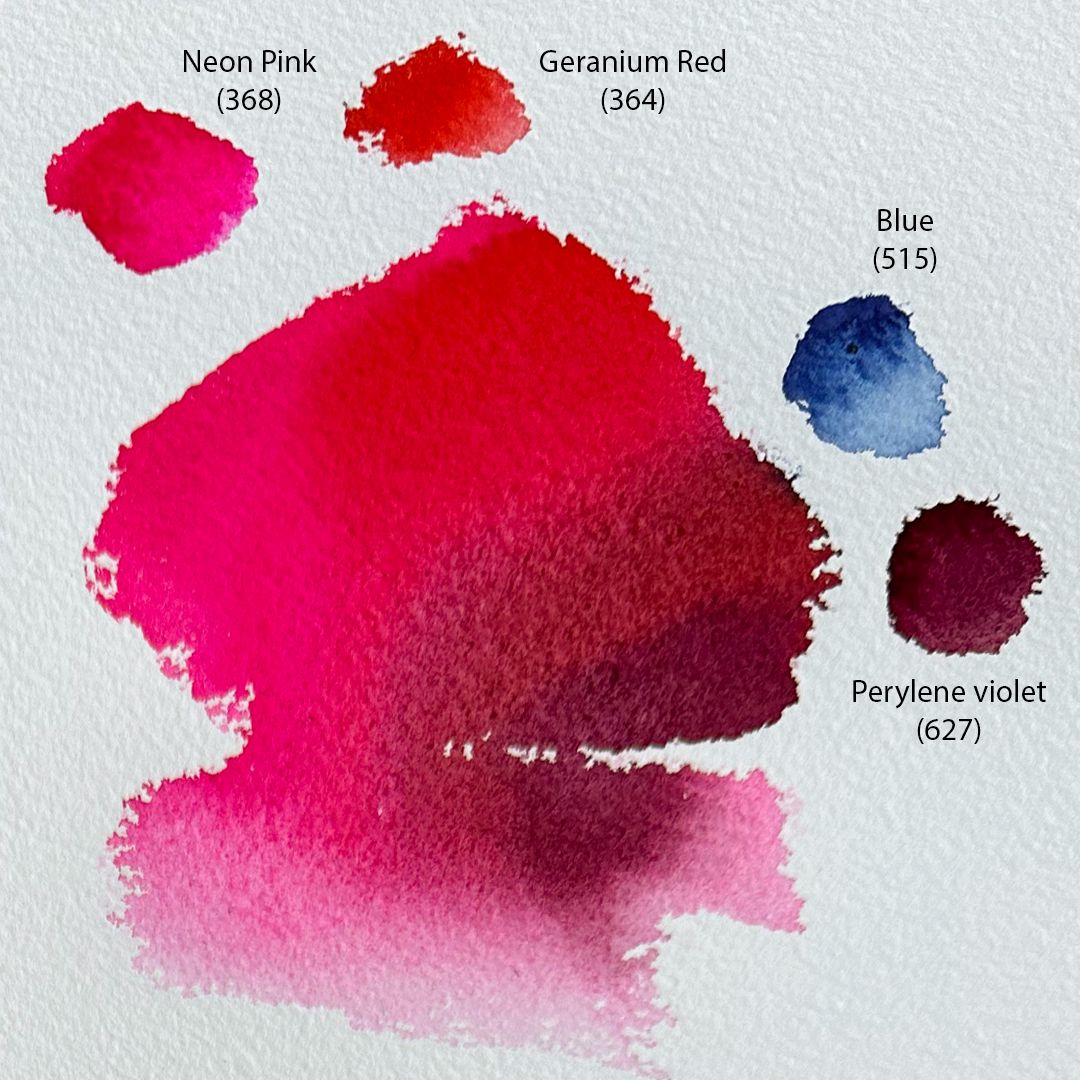 For the second flower, I make a mixture of Neon Pink + Geranium Red and get a rich pink (rose) colour, which I use as the main one. In the shadows, I add a little Perylene violet and Blue to the main colour, getting soft highlights and shadows.