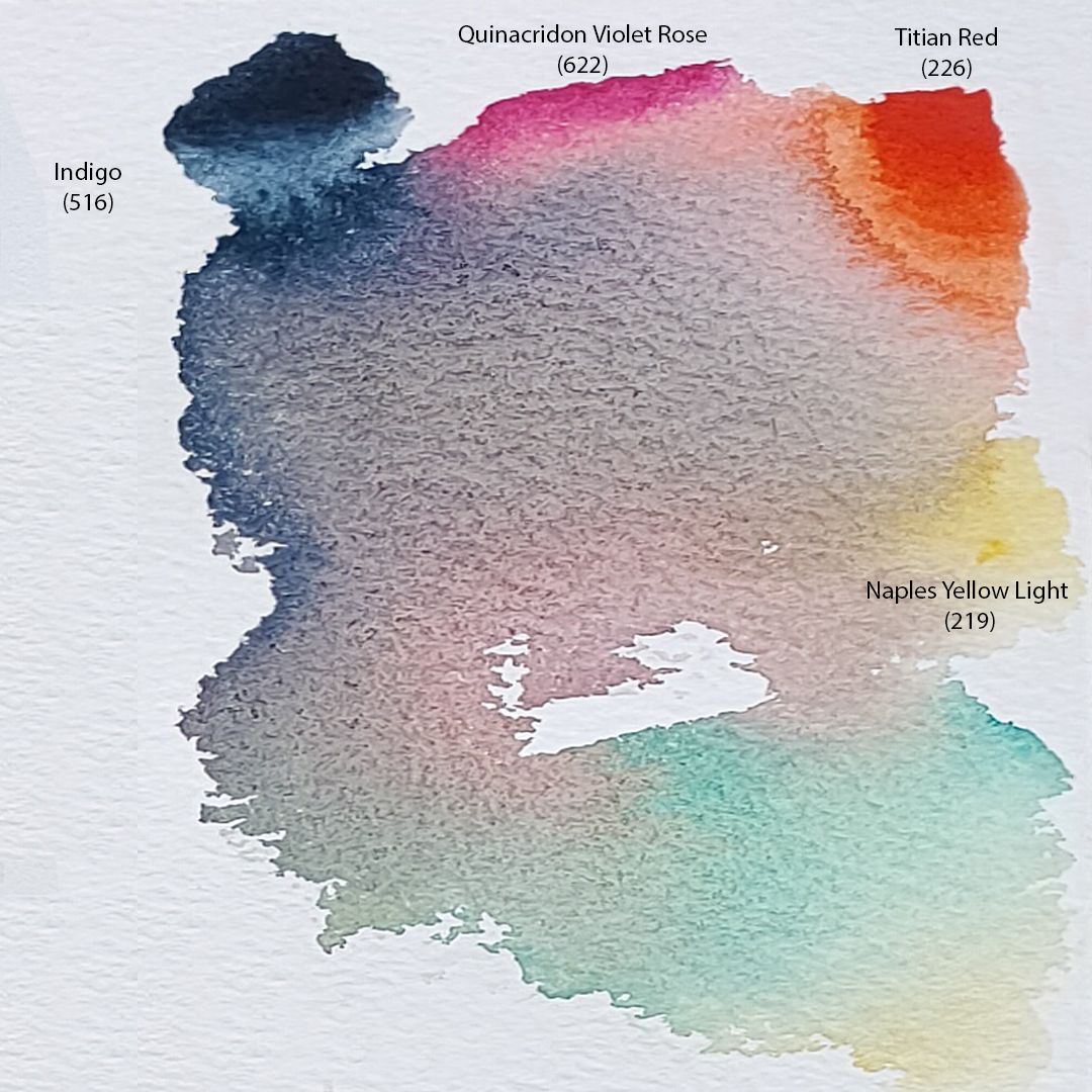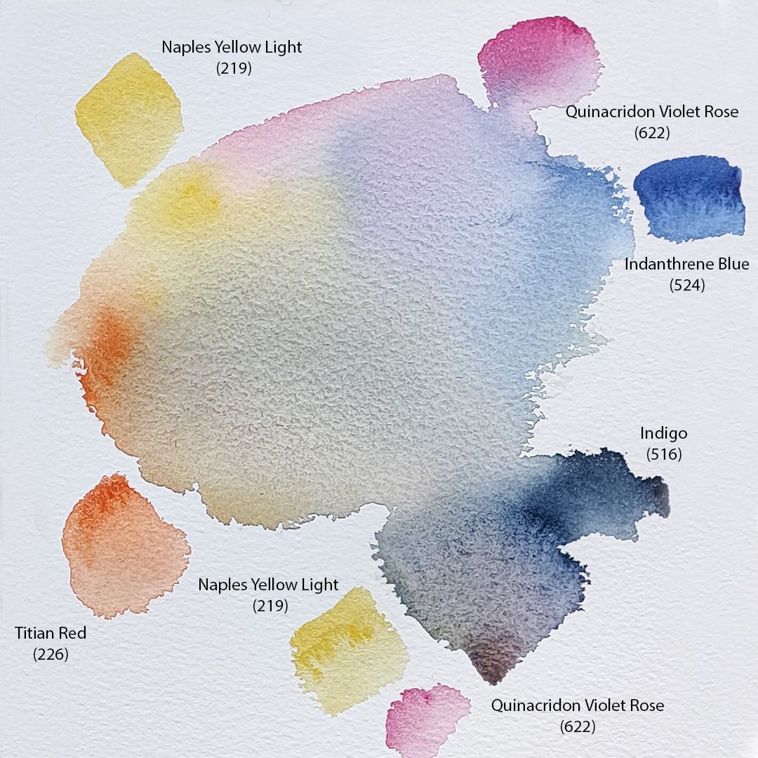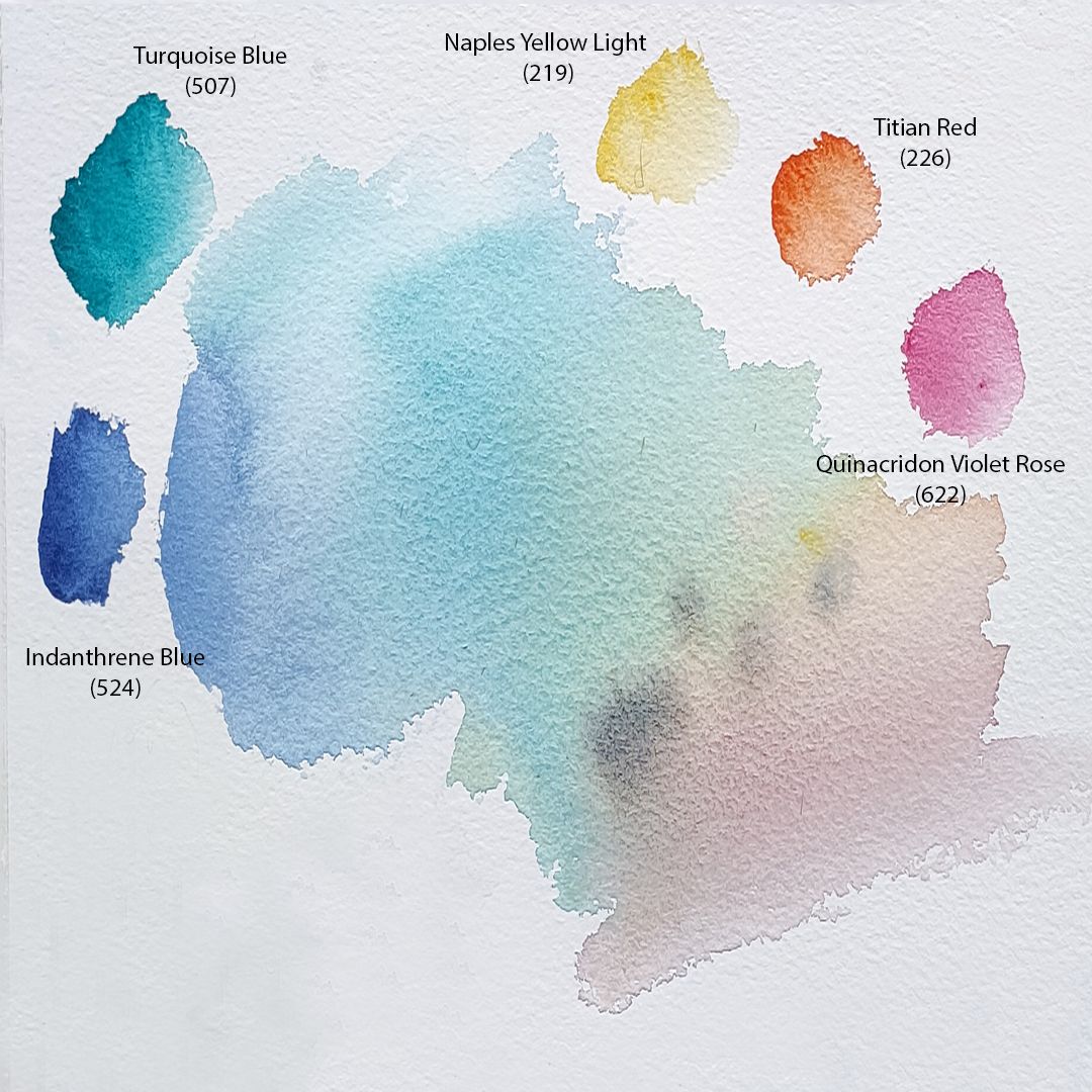 For the palette I chose 6 colours: 219. Naples Yellow Light (P.Y.216 ***■∆), 226. Titian Red (P.O.36 ***□◮), 622. Quinacridon Violet Rose (P.R.122 *** □▲), 524. Indanthrene Blue (P.B.60 *** □◮), 516. Indigo (P.Bk.7, P.B.15, P.V.23 *** ◨▲), 507. Turquoise Blue (P.B.15:3, P.G.7 *** □▲).