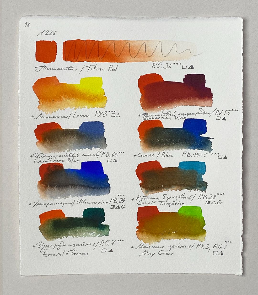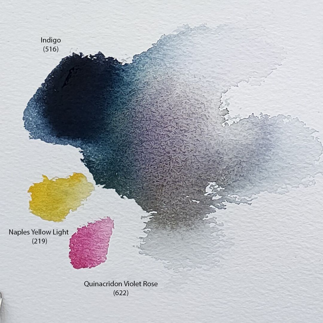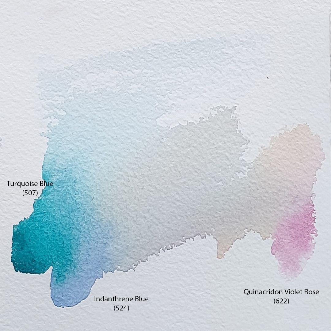 For the palette I chose 6 colours: 219. Naples Yellow Light (P.Y.216 ***■∆), 226. Titian Red (P.O.36 ***□◮), 622. Quinacridon Violet Rose (P.R.122 *** □▲), 524. Indanthrene Blue (P.B.60 *** □◮), 516. Indigo (P.Bk.7, P.B.15, P.V.23 *** ◨▲), 507. Turquoise Blue (P.B.15:3, P.G.7 *** □▲).