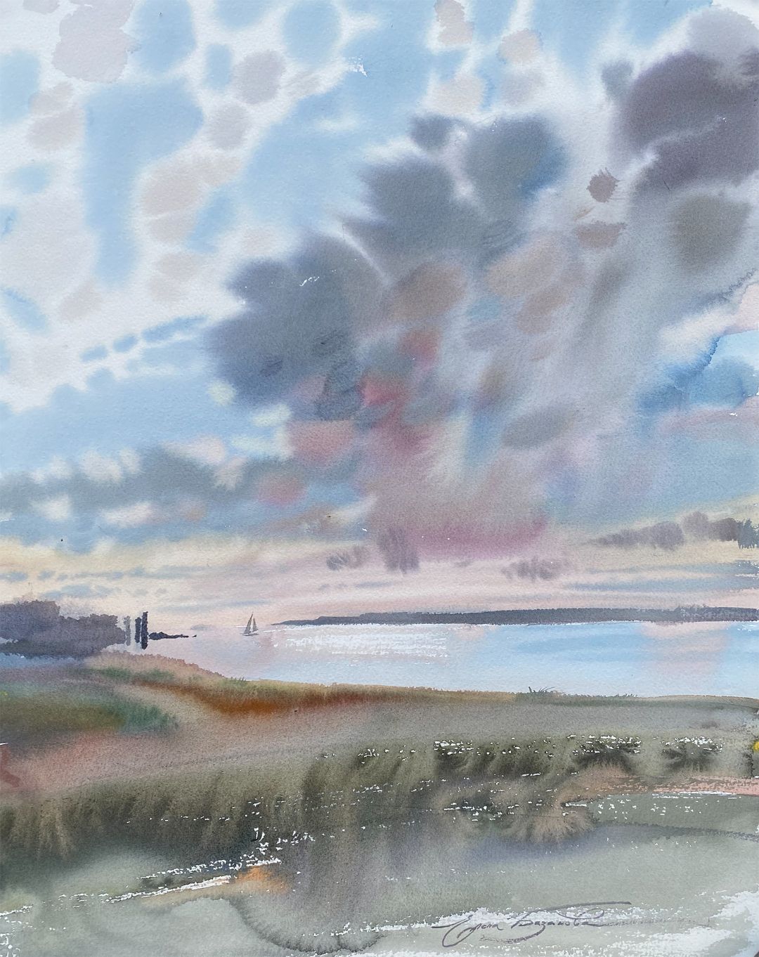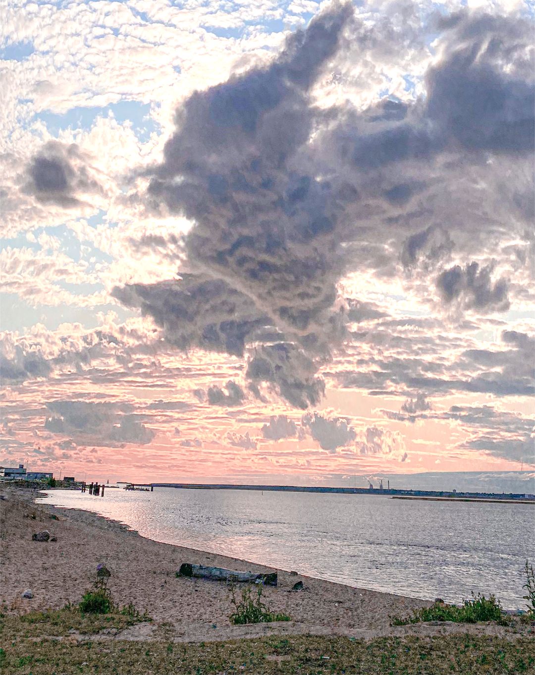I chose a place on the embankment of the Gulf of Finland on the outskirts of the city. A view with a wide horizon and a high sky filled with clouds. The rays of the setting sun flood everything with a soft warm light. The light of the setting sun is reflected from the upper light clouds and breaks through the heavier low clouds, so the upper clouds look brighter and whiter, because they are well lit, and the lower ones are darker, because they are in the counter-illumination. At the horizon, the sky is orange-pink, above – golden-yellow, and even higher blue with purple tints.